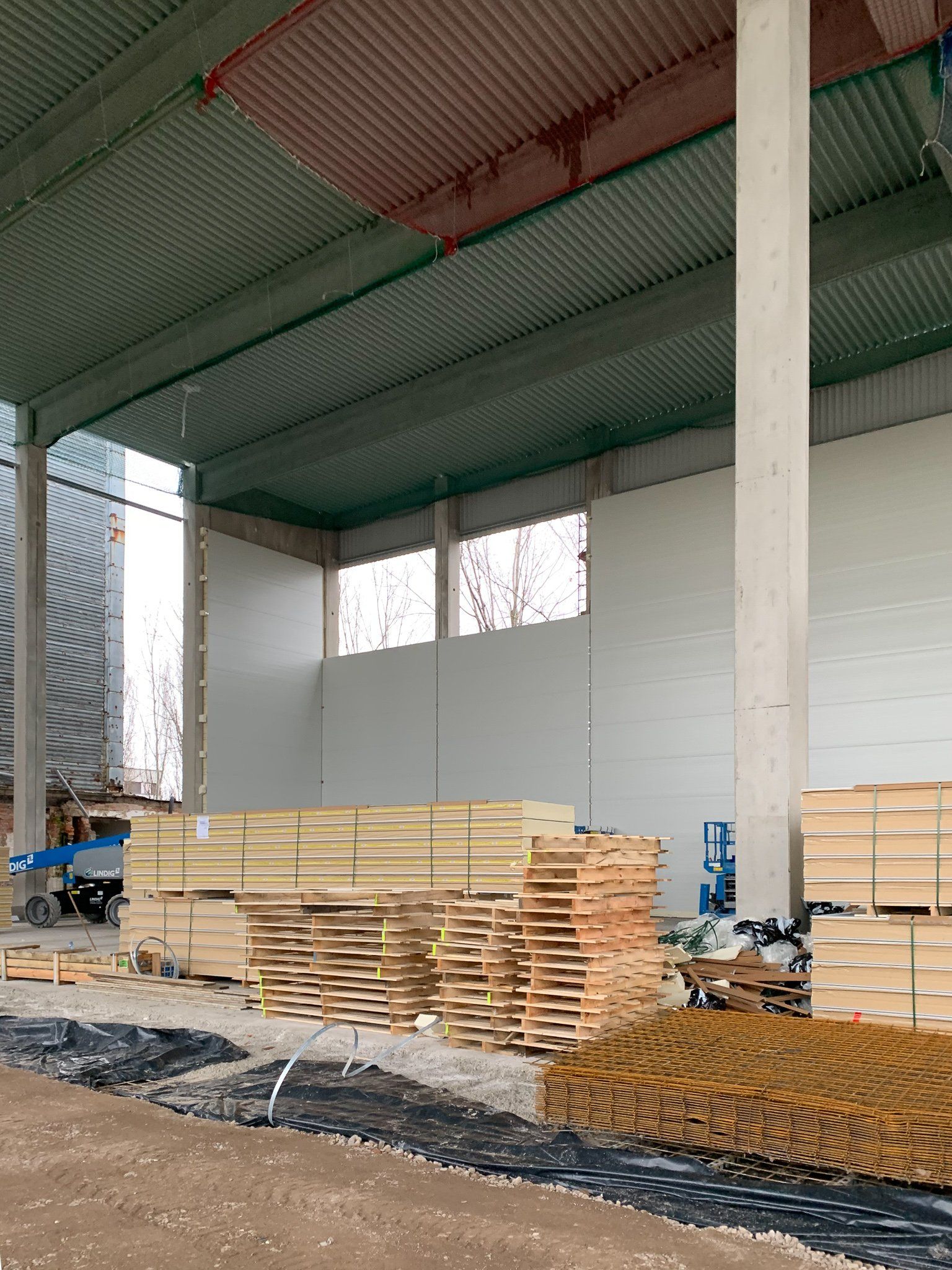 Erdarbeiten, Betonfertigteile, Dachtrapezbleche, Dachdämmung, Entwässerung, Fassade inkl. Türen und Tore Elektrotechnik (Licht und Ansteuerung Türen und Tore), Kältetechnik, Brandvermeidungsanlage, Bodendämmung inkl. Betonbodenplatte, LKW-Ladebrücke.